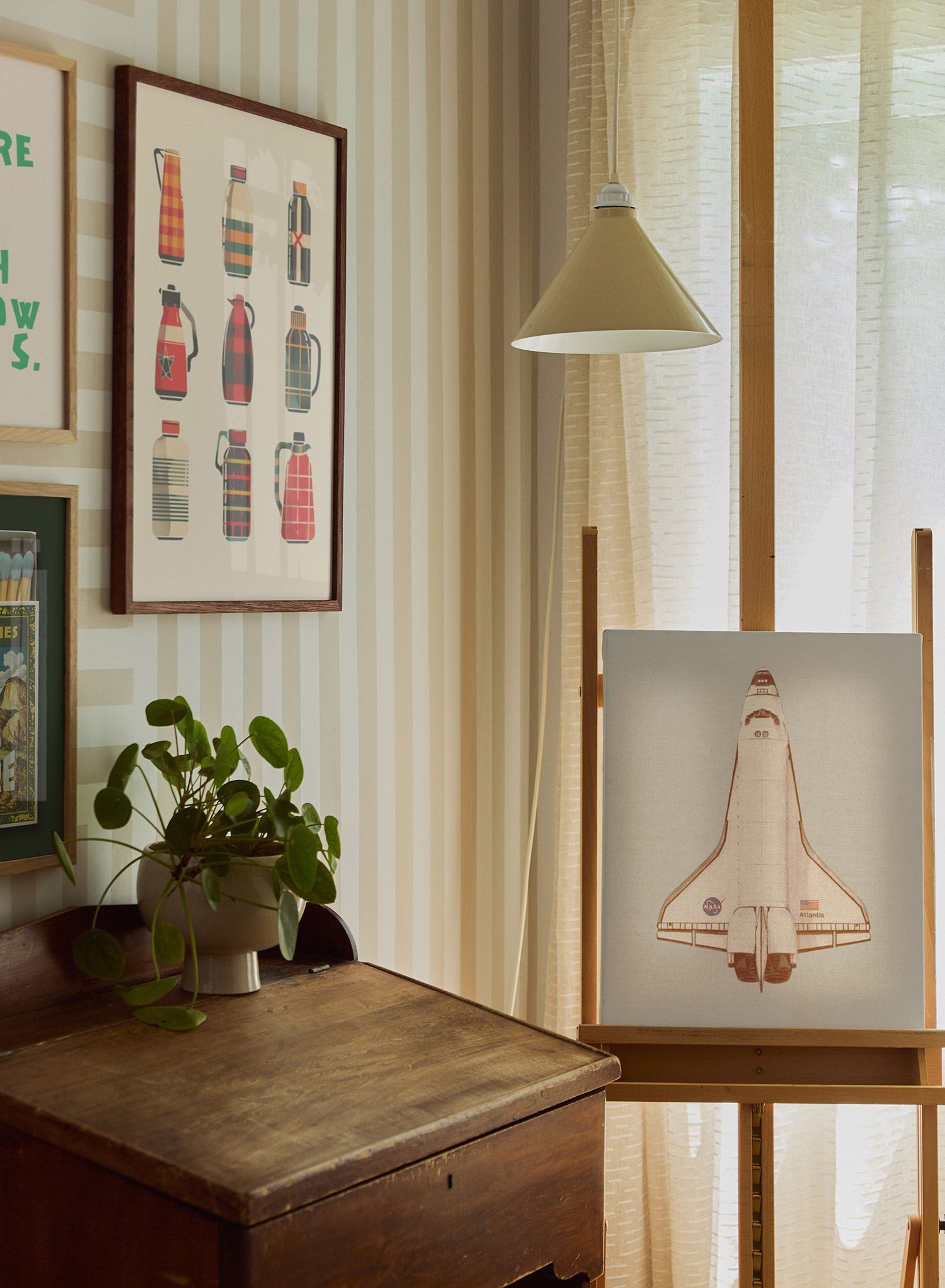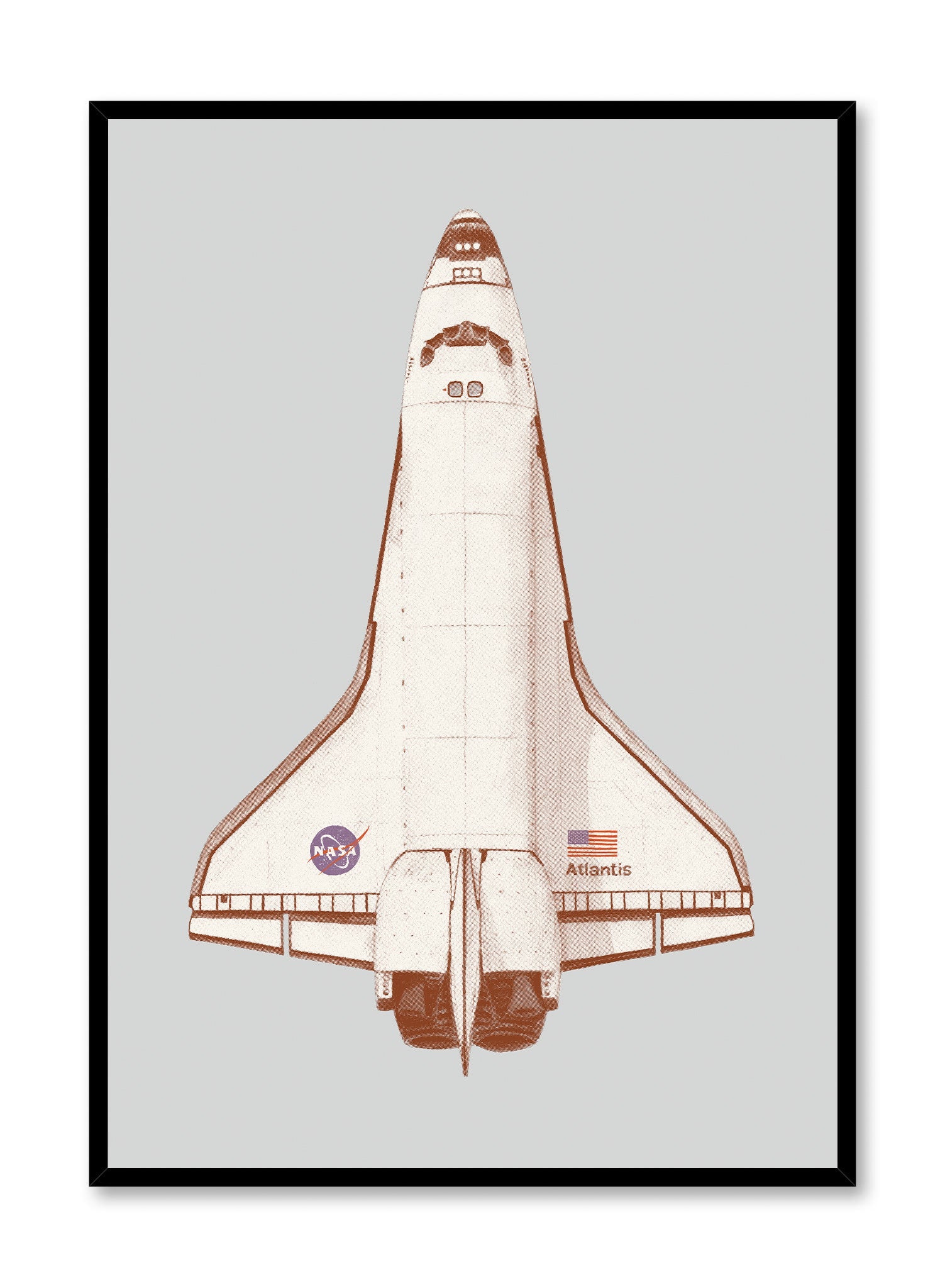 A detailed and inspiring print of the Space Shuttle Atlantis, set against a soft gray background. The intricate illustration captures the majesty and innovation of space exploration, with the NASA logo and shuttle details prominently displayed. The muted gray backdrop enhances the classic and sophisticated feel of this piece, making it perfect for any space enthusiast's collection.
